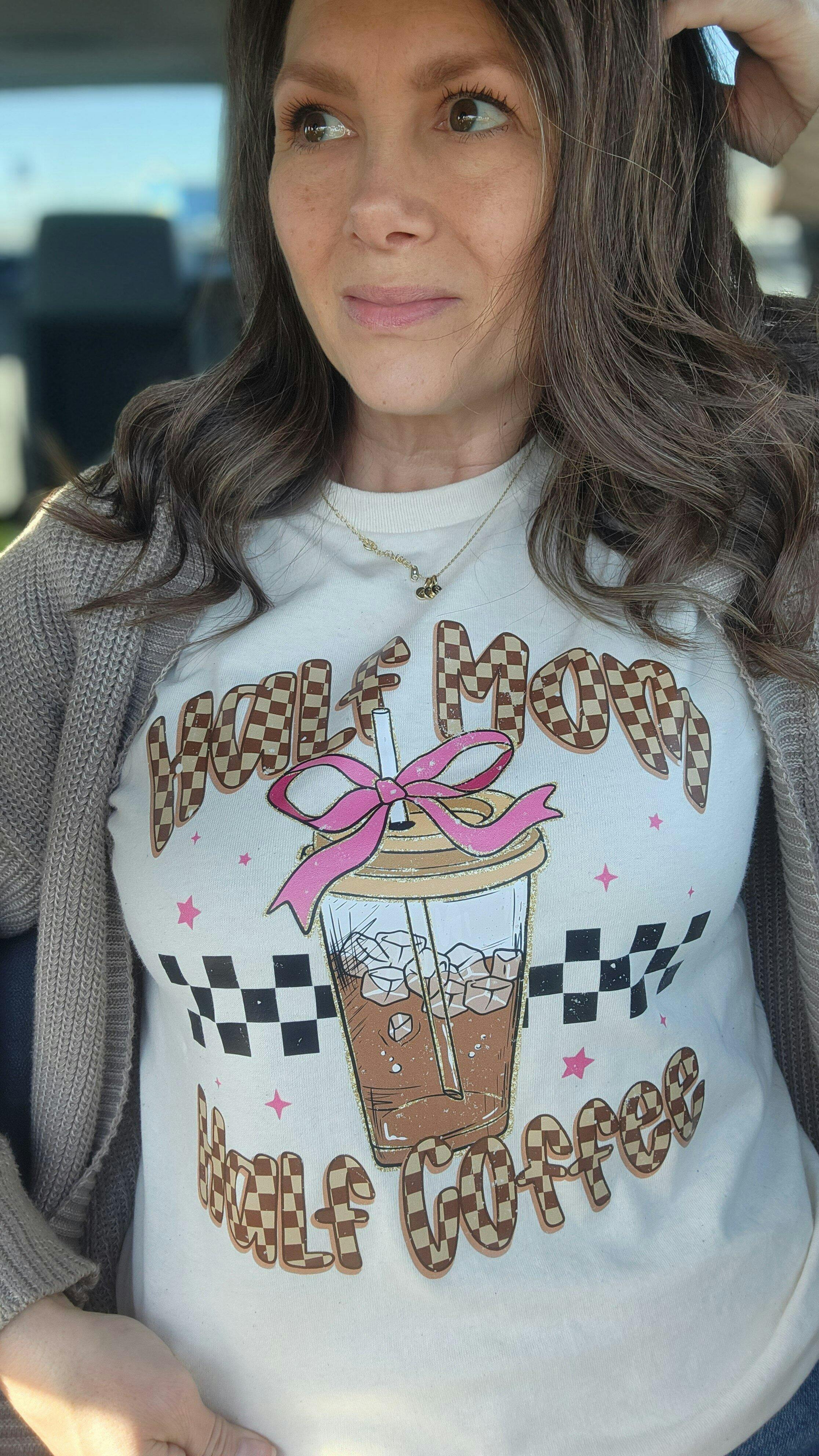 Running on love, chaos, and a whole lotta caffeine. This adorable tee says what we’re all thinking — Half Mom, Half Coffee. With its playful checkerboard lettering, sparkly pink accents, and iced coffee graphic tied up in a bow, this Comfort Colors tee is giving mom-life main character energy.